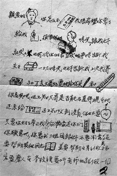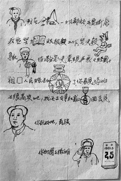 李征明生前写给父母和兄弟姊妹的6封家书有幸保存至今,字里行间体现了他对新中国的热爱,对家人的眷念,家国情怀扑面而来。在写给父母的信中,他希望姐姐和弟弟们追求进步,追上时代,早日加入党团组织:“青年人要找到光明前途,惟一参加革命工作和各种建设上去,和参加组织更是重要的政治生命。”在给妹妹的信中,则告诫她们努力学习知识,并用自己的津贴结余为妹妹购买学习用品。家书中不仅有文字,还配有许多图画,显示出他的才华和意趣。