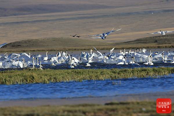 金秋时节,新疆维吾尔自治区和静县巴音布鲁克湿地草原的天鹅吹起集结号。大天鹅带领羽翼渐丰的小天鹅在湖面上练习飞行,为即将到来的迁徙做准备。(新疆维吾尔自治区和静县纪委监委供 赛尔木加甫 摄)