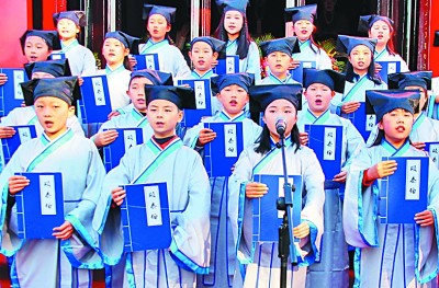 江苏苏州平江实验学校的学生在“冬至大如年”民俗文化节上诵读国学经典。王建康摄/光明图片