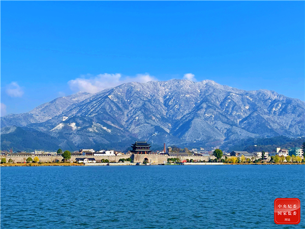 浙江省建德市梅城古镇迎来了初雪,在澄清门下,远处被雪覆盖的乌龙山和近处湛蓝的新安江交相辉映。(浙江省建德市纪委监委供 章斌 摄)