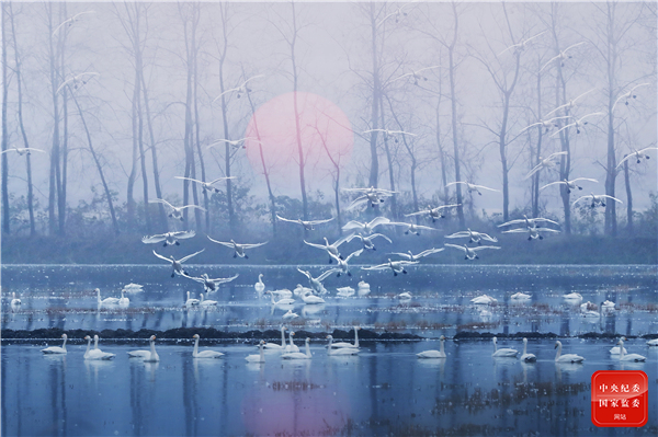 冬日清晨,湖里的水鸟或嬉戏畅游,或整理羽毛,或展翅翱翔,在一轮红日的映照下,构成了静谧温暖的冬日美景。(江西省莲花县纪委监委供 彭学平 摄)