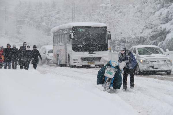 12月28日以来,今冬影响我国的最强寒潮自北向南“冻透”了大半个中国,带来速冻式降温和混合式雨雪。图为12月30日早晨,山东威海市民在冒雪出行。(图片来源:视觉中国)
