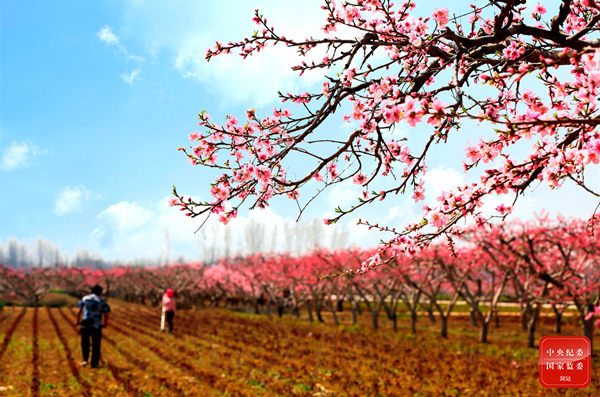阳春三月,安徽省亳州市谯城区的桃园里,桃花竞相绽放,花香四溢,蓝天白云、桃花与忙于耕作的身影相映成趣,呈现出一派生机盎然的景象。(安徽省亳州市纪委监委供 程伟如 摄)