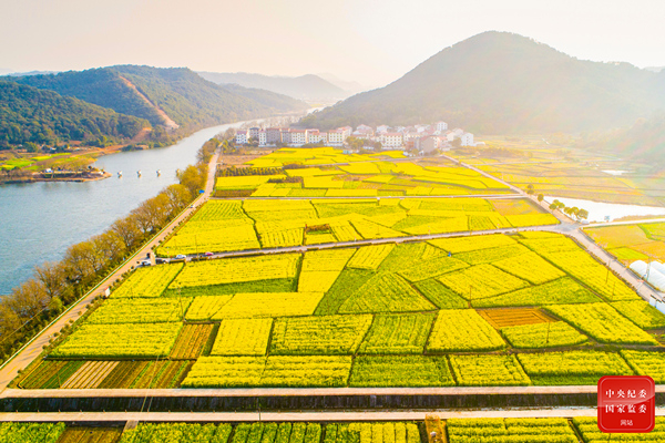 金色阳光照耀下,金黄油菜花田铺满大地,与远处的绿水青山构成了一幅靓丽的春日美景图。(浙江省浦江县纪委监委供 赵新尧 摄)