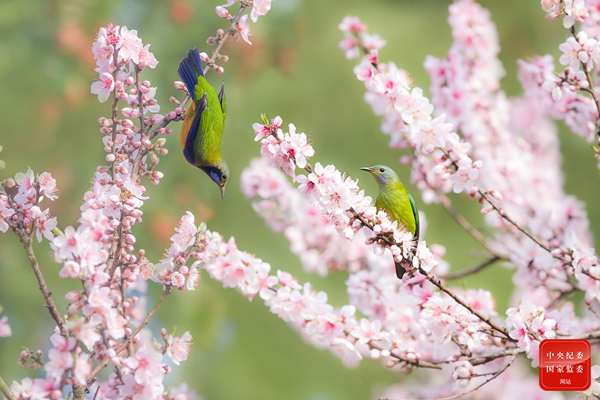 春花开放,挂满枝头,引来众多鸟儿驻足品芳,好一幅鸟语花香的春天画卷。(江西省九江市濂溪区纪委监委供 熊伟 摄)