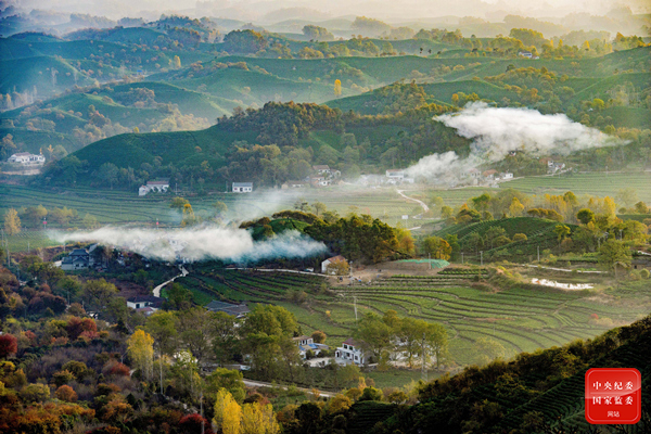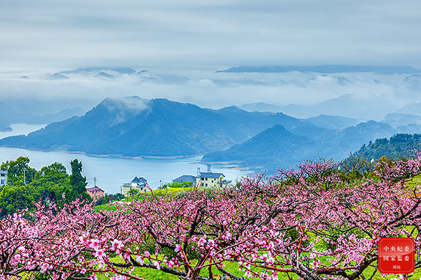 春日,桃花盛开。清晨在山上眺望,桃花、民居、湖水和云雾缭绕的远山映入眼帘,美不胜收。(杭州市纪委监委供 郑进奇 摄)