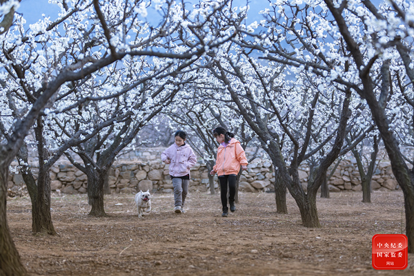 小山下,杏林边,春风里,万亩杏林花开成海,玉露凝香,稚嫩的童谣邂逅一场浪漫的花事,惊艳了整个春天。(山东省邹平市纪委监委供 李刚 摄)