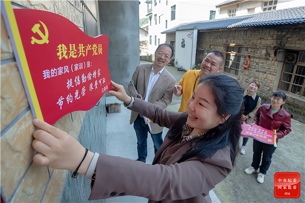 杭州市淳安县纪委监委通过党员带头亮家风、诵读优秀家训、我的家风征文等活动,把清廉文化建设与家风家教建设结合起来,培育良好家风。图为淳安县富文乡漠川村党员干部把家风家训挂在自家的大门上。(杭州市淳安县纪委监委 毛勇锋 摄)