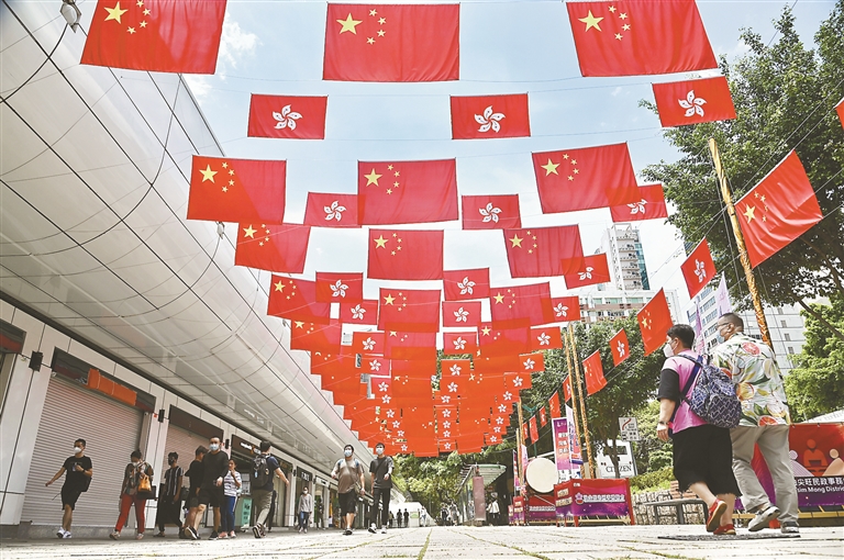 一抹中国红,倾诉着对祖国怀抱的眷恋与信任。25年前,五星红旗在香港会议展览中心冉冉升起,宣告中国政府恢复对香港行使主权。25年来,我们看到,世界最长跨海大桥港珠澳大桥在这里开通,粤港澳大湾区建设展现国际一流湾区蓬勃的生命力,香港国安法出台实现“一法安香江”,选举制度落实“爱国者治港”原则开启良政善治新局面……在“一国两制”方针指导下,乘着国家发展的东风,这颗璀璨的“东方之珠”书写出经济社会繁荣稳定发展的精彩篇章。