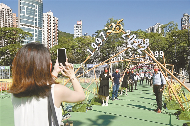 6月28日,香港各界庆典委员会于铜锣湾维多利亚公园以庆回归为主题设置不同的大型展示打卡装置,包括国旗区旗展示、水幕特效展示等特色打卡点。图为市民入场拍照。 李志华 摄