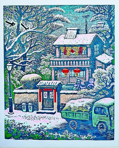 乡亲们说,“要致富,先修路”。画里公路已从家门口通过,路旁还有路灯。偏僻的乡村再也不愁跟外界往来了,农产品能顺畅外销。公路上飞奔而过的小货车正忙着送货。物流通畅,乡镇产业兴旺,农民自然富起来。实施“生态宜居”,农民居住环境得到明显改善。看小院四周林木环抱,小楼屋顶还装有太阳能热水器。再看小院矮墙外放置着分类垃圾桶,不仅环保,更体现着乡风文明。天上飘着雪花,小院银装素裹,在朝霞里分外妖娆。瑞雪兆丰年,正是大年初一的早晨,年味十足的农家院,大门上贴有春联门画。小楼屋檐下悬挂着红灯笼,楼上窗户贴有福字,两旁挂满金灿灿的玉米和红艳艳的辣椒。这是农家晒出的丰收成果。小院里静悄悄,人都去哪儿了?从大门外的一地鞭焰碎屑便知答案。昨夜正是除夕,人们辞旧岁迎新年,太兴奋太疲倦了,也许现在正酣睡。再看看屋顶上的电视天线,也许他们正在看昨晚没顾上看的春晚节目重播哩。这故事有趣吧,我就是将这诸多细节有机地整合成“小康农家喜迎春”的完整故事。(廖开明)
