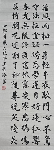本作品以传统书法为载体,书写《七律·清廉》,借经典文学与书法艺术诠释廉洁内涵。“清风两袖一身轻” 等句,传递廉洁自律、拒贪守正精神;“学莲自好”以莲喻廉,呼应廉洁文化意象。画面采用简约的竖版布局,以留白表现纯净。书法字体端庄规整,契合廉洁主题的庄重性,墨色浓淡相宜,营造清正氛围。将文学之美、书法之韵与廉洁精神融合,以艺术形式铸魂,引导观者在品赏中感悟廉洁价值,传承清廉风尚。