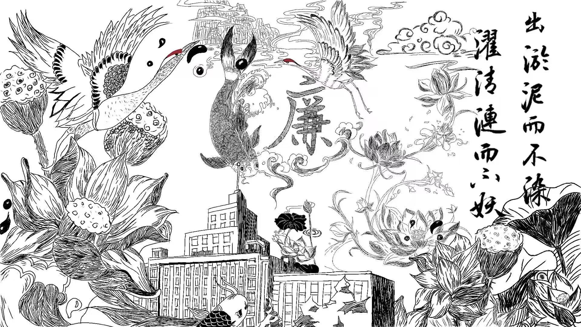 作品以“鱼鹤围廉”为核心意象:灵动的鱼与高洁的鹤首尾相衔,环成圆满之圈,将“廉”字稳稳护于中央,既显和谐之美,更喻“廉”为根本、需常守不怠。四周仙鹤翩跹,引颈向廉,暗合清正风骨;莲花次第绽放,洁蕊凝露,呼应“出淤泥而不染,濯清涟而不妖”的箴言。背景融入校园建筑剪影,让廉洁意象与育人环境相融,既承传统文化中“廉”的精髓,又显廉洁之风在校园中的浸润与传承,以画寄意,传递“铸廉魂于日常,植清风于校园”的理念。