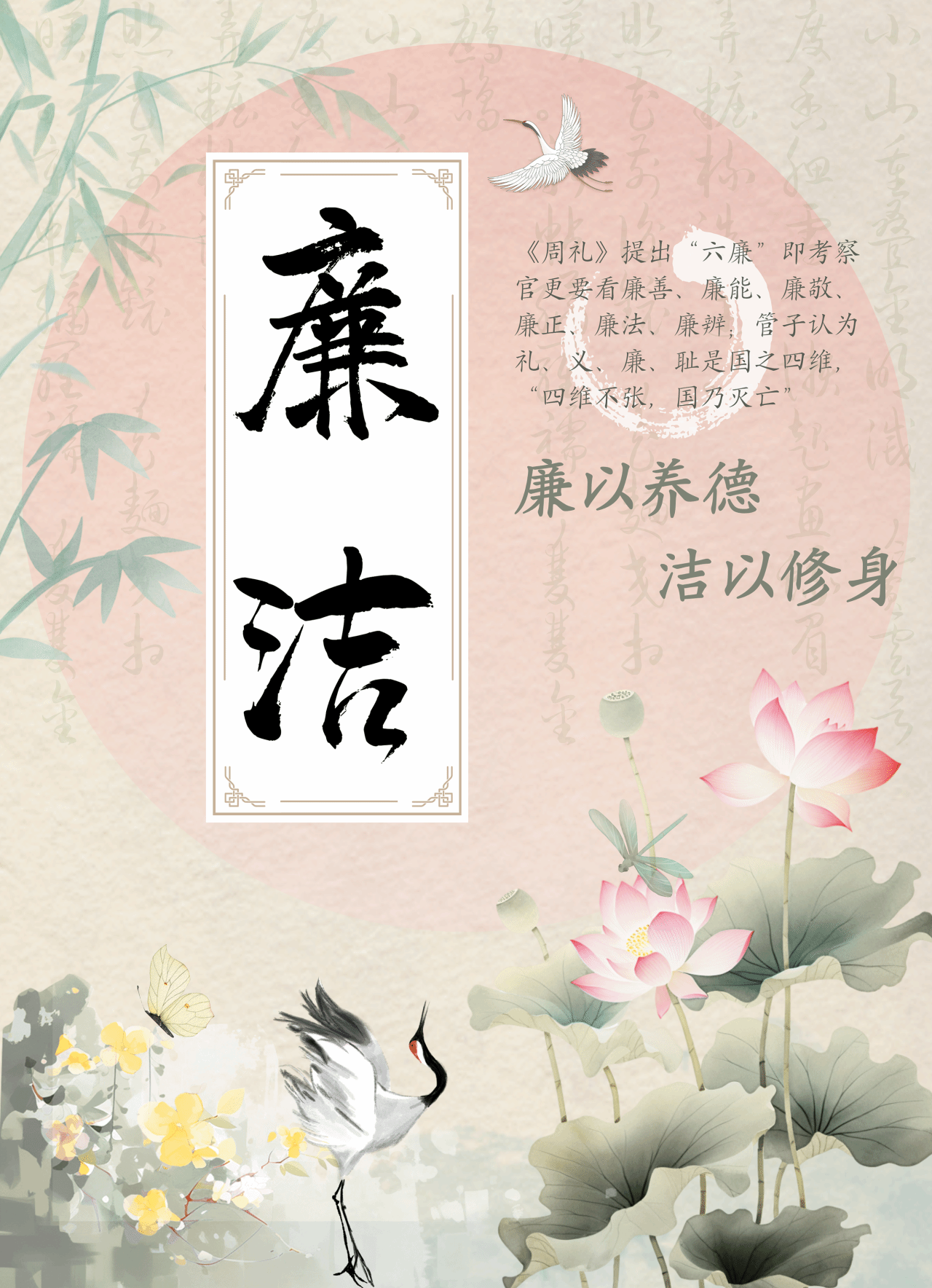 该海报作品旨在以古典韵味传递千年廉脉,引《周礼》“六廉”、管子“四维”,回溯廉洁作为治国修身根基的历史渊源。选仙鹤喻高洁、莲花表守正,借传统意象寄寓廉德追求。“廉以养德,洁以修身”,旨在让观者悟得:廉洁是滋养精神、立定人格的养分。盼这海报以文化为桥,让廉洁跨越时空,浸润心灵,聚个体修身之力,培厚清朗风气,筑牢价值根基。