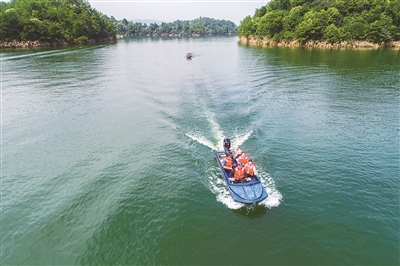 图片说明:绿水青山就是金山银山。党的十八大以来,以习近平同志为核心的党中央把生态文明建设纳入“五位一体”总体布局,以最坚定的决心、最严格的制度、最有力的举措,推动我国生态文明建设不断迈上新台阶。浙江省杭州市淳安县坚持绿色发展道路,积极践行“两山”理论,建设特别生态功能区,探索不同于传统工业化的产业生态化、生态产业化融合发展的新模式,将保护生态环境、推动绿色发展、增进民生福祉融合统一,在实现“水畅、水净、水安、水美、水惠”的“五水”目标上不断取得新进步。图为8月11日,淳安县相关职能部门对千岛湖沿湖地带建设项目、涉水环保等方面情况进行联合巡查。(淳安县融媒体中心记者 王建才 摄)