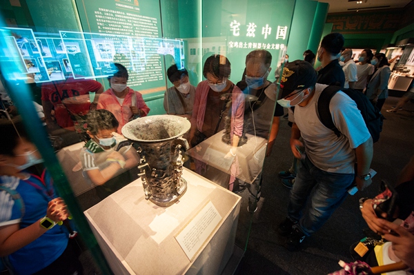 距今3000多年的青铜何尊,器内底部有122字铭文。其中的“宅兹中国”,是关于“中国”一词最早的文字记载,彰显了中华文化源远流长的独特魅力。图为2020年8月18日,观众在国家博物馆“宅兹中国——宝鸡出土青铜器与金文精华”展上观看展出的何尊。(图片来源:视觉中国)
